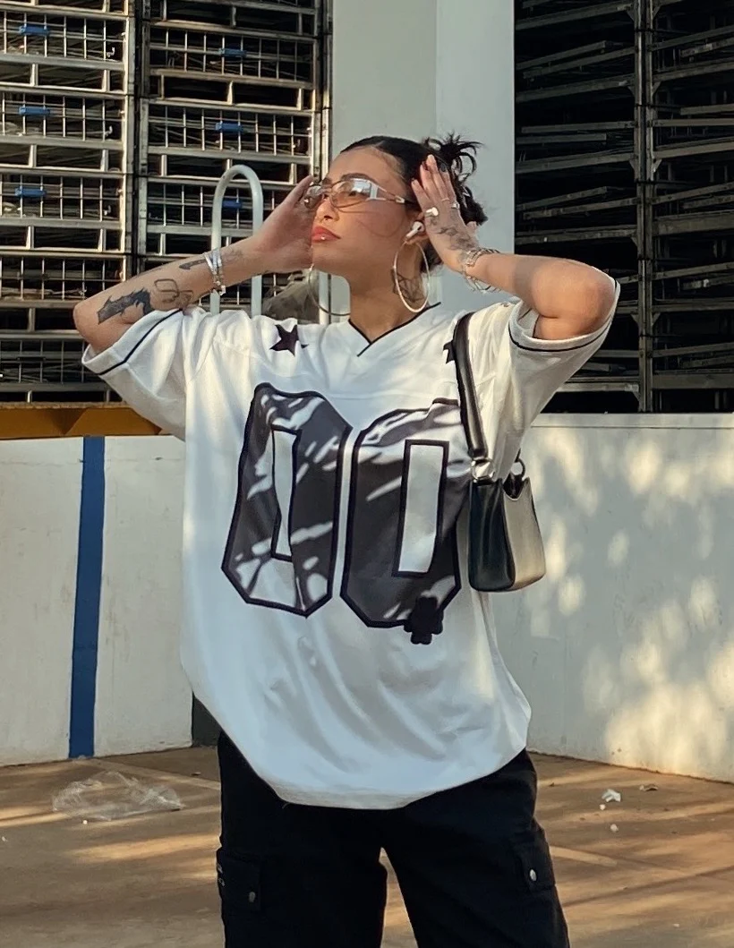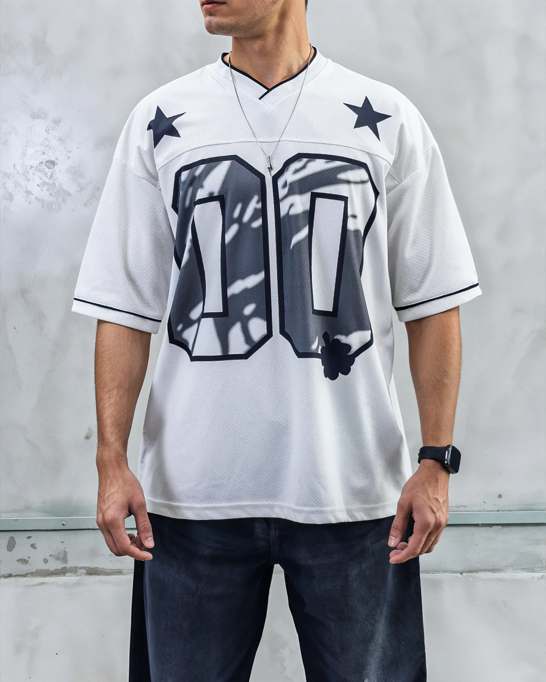 “00” front print, star shoulder detail, cosmic-inspired design |